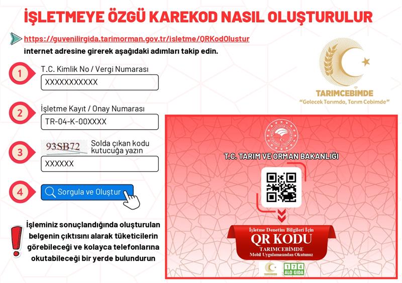 Bakanlığımızca hazırlanan ve her bir işletmeye özel gıda işletmesi karekodu gıda işletmelerince https://guvenilirgida.tarimorman.gov.tr/isletme/QRKodOlustur internet adresinden oluşturularak tüketicilere sunulabilir.