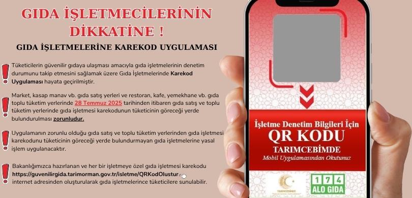 Bakanlığımızca uygulamanın zorunlu olduğu gıda satış ve toplu tüketim yerlerinden gıda işletmesi karekodunu tüketicinin göreceği yerde bulundurmayan gıda işletmelerine 28 Temmuz 2025 tarihinden itibaren yasal işlem uygulanacaktır.