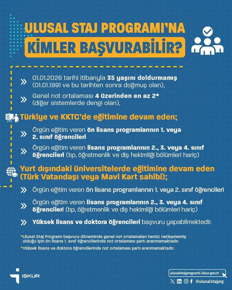 *Ulusal Staj Programı başvuru döneminde genel not ortalamaları henüz netleşmemiş olduğu için ön lisans 1. sınıf öğrencilerinde not ortalaması şartı aranmamaktadır.*Yüksek lisans ve doktora öğrencilerinde not ortalaması şartı aranmamaktadır.