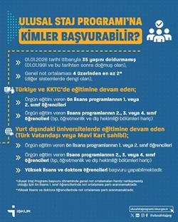 Ulusal Staj Programı, genç insan kaynağımızın kamu kurumları ve özel sektör kuruluşlarınca sağlanan kariyer olanaklarından faydalanmasını sağlamak amacıyla Cumhurbaşkanlığı himayelerinde, Çalışma ve Sosyal Güvenlik Bakanlığı destekleriyle ve Türkiye İş Kurumu (İŞKUR) koordinasyonunda yürütülen erken dönem kariyer programıdır. Program aracılığıyla; gençlerimizin istihdam edilebilirliklerinin artırılması, kariyer olanaklarına erişimde fırsat eşitliğinin desteklenmesi ve bu imkânların tüm üniversite bölümlerine yaygınlaştırılması hedeflenmektedir.